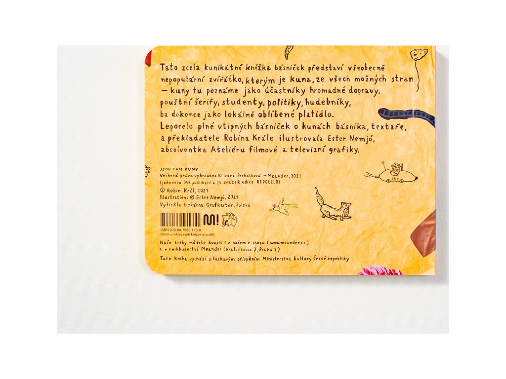 Tato zcela kunikátní knížka básniček představí všeobecně nepopulární zvířátko, kterým je kuna, ze všech možných stran – kuny tu poznáme jako účastníky hromadné dopravy, pouštní šerify, studenty, politiky, hudebníky, ba dokonce jako lokálně oblíbené platidlo. Leporelo plné vtipných básniček o kunách básníka, textaře a překladatele Robina Krále ilustrovala Ester Nemjó, absolventka Ateliéru filmové a televizní grafiky na UMPRUM.