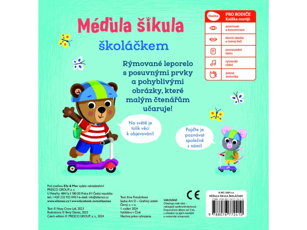 Pojďte objevovat svět společně s Méďulou šikulou! Rýmované leporelo s posuvnými prvky a pohyblivými obrázky malým čtenářům jednoduše učaruje. Knížkou je provede roztomilý méďa, který umí snad úplně všechno… V celé sérii titulů, která nese jeho jméno, se postupně objevuje v nejrůznějších rolích. Ať už se stane astronautem, automechanikem, farmářem, potápěčem, strojvedoucím, veterinářem, táborníkem nebo školáčkem, zvládne Méďula všechno levou zadní!