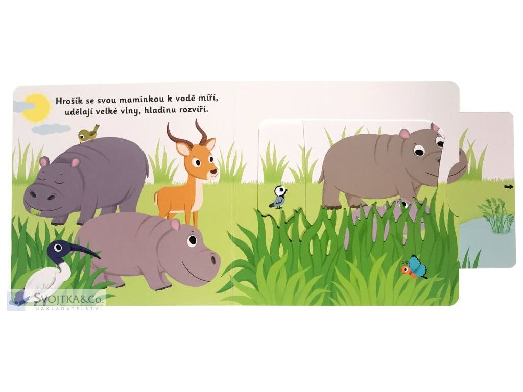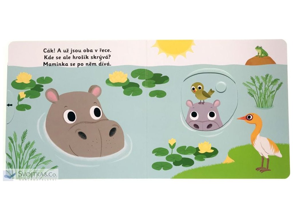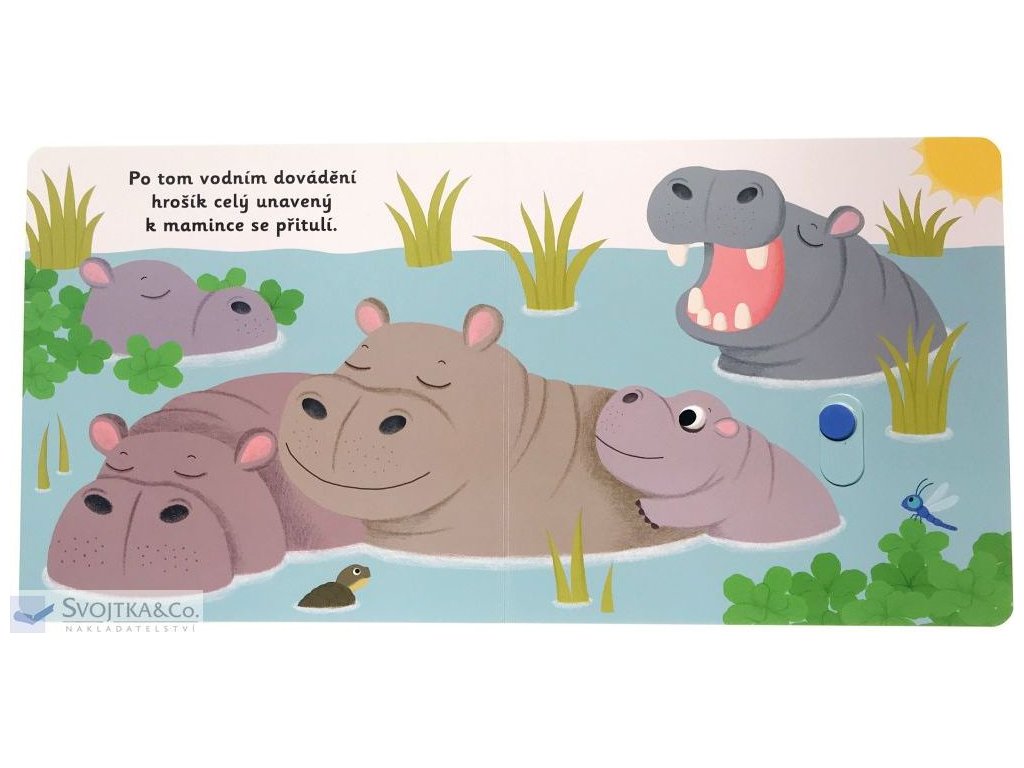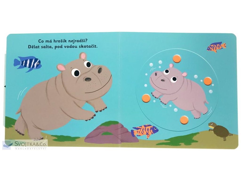 "Co má hrošík nejradši? Dělat salta, pod vodou skotačit." Objevovat svět s tímto leporelem pro nejmenší děti od jednoho roku je tak zábavné! Pevné stránky s pohyblivými prvky procvičí i jemnou motoriku. Stačí jen vložit prstík do správného otvoru a lehce vysunout, zatáhnout nebo otočit a hned bude váš malý objevitel znát odpovědi.