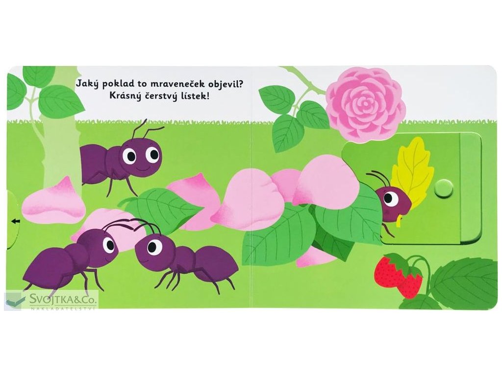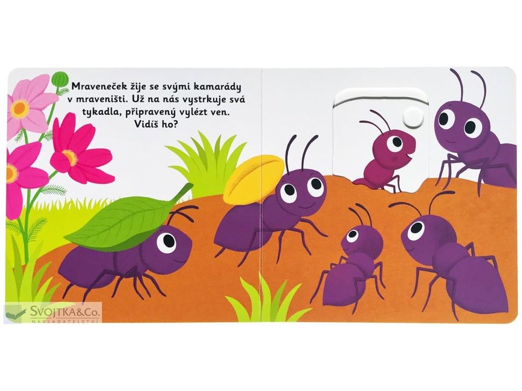 Mraveneček vystrčil tykadla z mraveniště a už běží objevovat a prozkoumávat okolí. Všichni mravenci pilně pracují a náš mraveneček pomáhá ostatním najít správnou cestu a donést do mraveniště zajímavé poklady. Objevovat svět s tímto leporelem pro nejmenší děti od jednoho roku je tak zábavné! Pevné stránky s pohyblivými prvky procvičí i jemnou motoriku. Stačí jen vložit prstík do správného otvoru a lehce vysunout, zatáhnout nebo otočit a hned bude váš malý objevitel znát odpovědi.