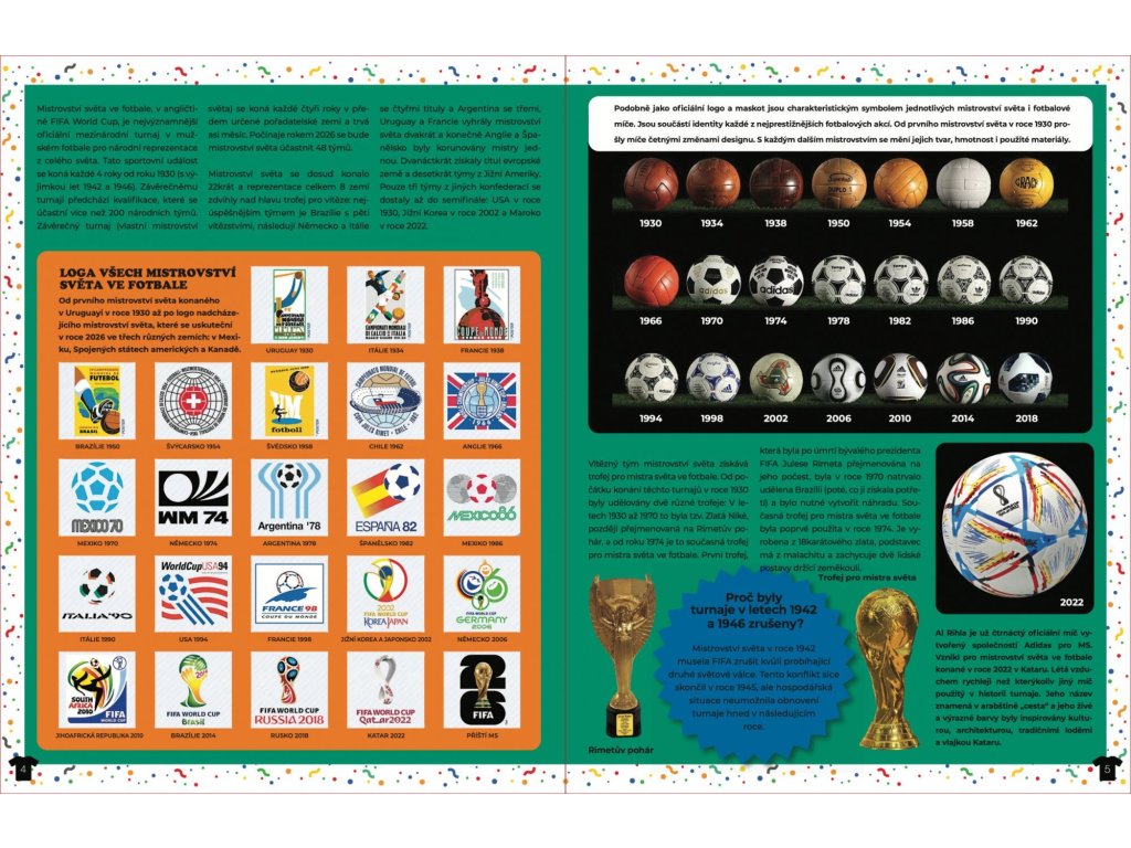 V této knížce se dozvíte spoustu věcí o 80 vybraných národních fotbalových týmech, které se aktuálně nacházejí na pozicích v rozmezí 1 až 114 podle mužského žebříčku FIFA. Najdete tu vlajky zemí, které se účastnily mistrovství světa ve fotbale, od toho prvního, jež se konalo v roce 1930 v Uruguayi, až po to zatím poslední v Kataru v roce 2022. Dočtete se klíčové údaje a další informace o mistrovstvích světa: nejlepší střelci, výsledky různých zápasů a týmy, kterým se dostalo té cti, že jednou či vícekrát mistrovství světa vyhrály. Prohlédnete si trofeje pro vítěze, které se v průběhu let používaly, loga všech proběhlých turnajů a také to, jak se od roku 1930 používané míče změnily. V neposlední řadě objevíte samolepky dresů národních fotbalových reprezentací, které informace obsažené v knize výborně doplňují.Doplňkové parametry