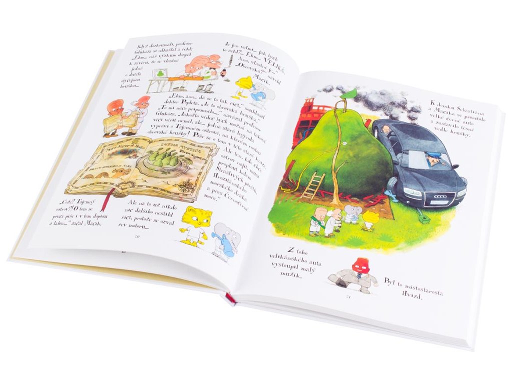 Kocourek Macík a slon Sebastián z přímořského městečka Sluníčkova nevěří svým vlastním očím: na zahradě jim v noci vyrostla obrovská hruška. Skutečný zázrak přírody! Zázrak…, až na to, že jim téměř povalila domek. Co s ní? „Vydlabeme dužinu a odvezeme ji pryč,“ rozhodnou se Macík se Sebastiánem. To je nápad! Přívěs s hruškou se však nešťastnou náhodou dává do pohybu. Nejprve pomalu, pak rychleji a ještě rychleji z kopce dolů, a …cááák! Hruška s ohlušujícím šplouchnutím padá do moře s Macíkem, Sebastiánem a profesorem Glukózou uvnitř. A tady začíná Macíkova a Sebastiánova neuvěřitelná cesta za Tajemným ostrovem, cesta plná dobrodružství….