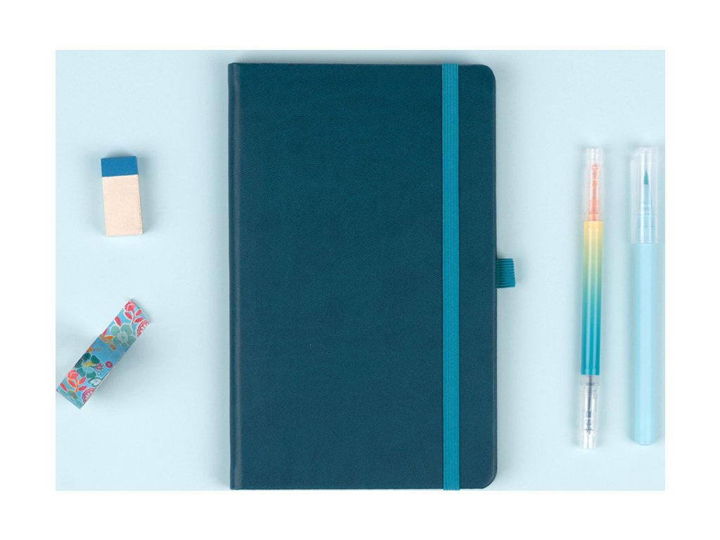 Praktický a lehký linkovaný notes v trendy tyrkysové barvě má povrch s jemnou strukturou, na který si můžete nechat vyrazit logo společnosti. Notes má pevnou knižní vazbu a zakulacené rohy, poutko na tužku, elastickou gumičku a textilní záložku. Linky mají 6 mm a jsou na kvalitním žlutém papíře.