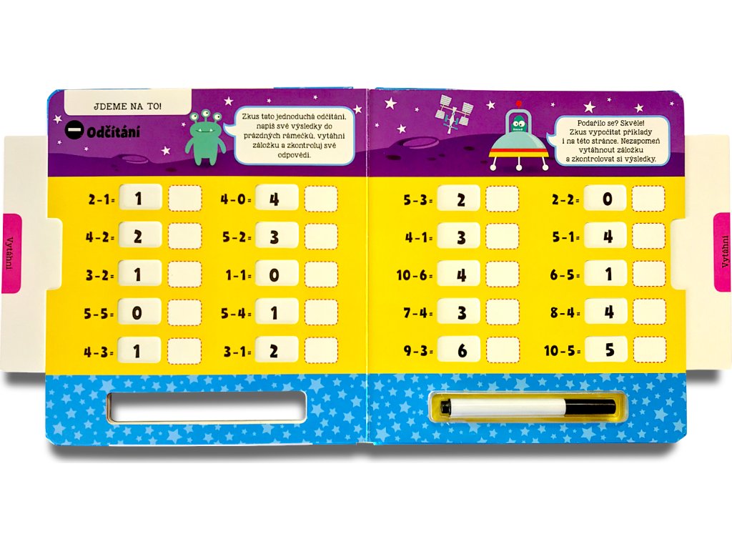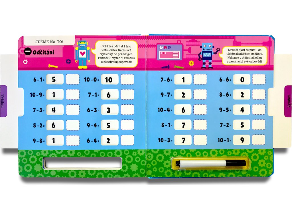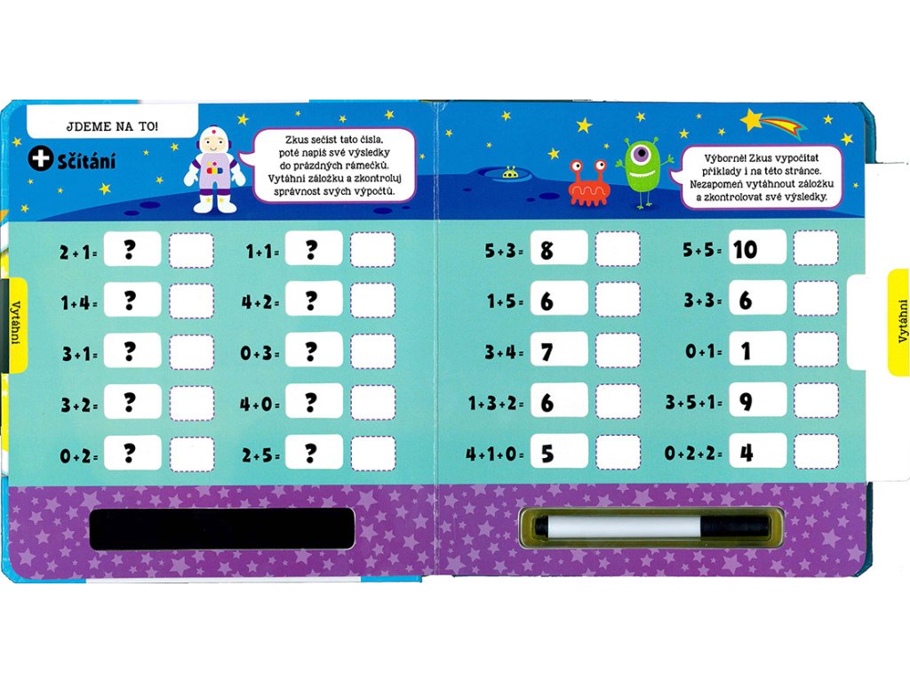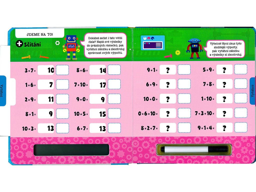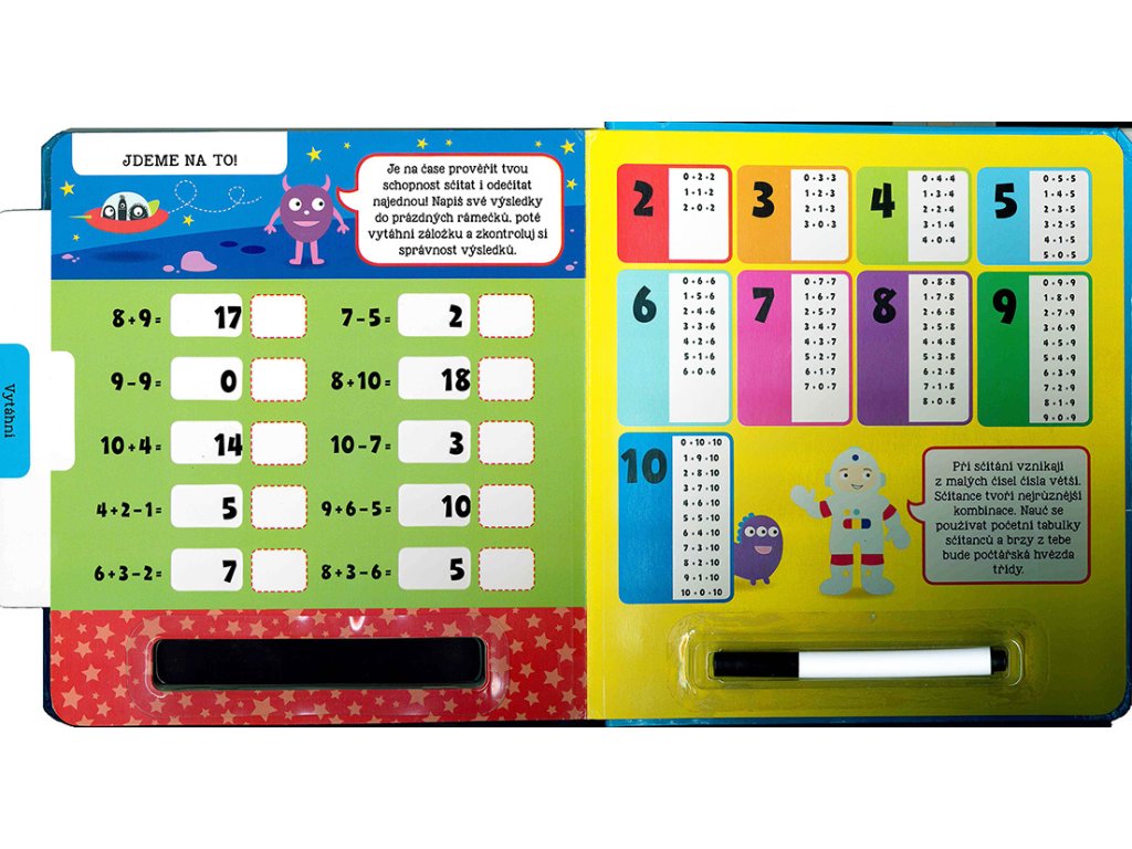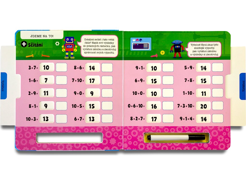Nejde ti sčítání nebo odčítání? Potřebuješ procvičovat? Tato interaktivní knížka ti pomůže naučit se perfektně sčítat i odčítat. Napiš své výsledky stíratelným fixem do prázdných rámečků, vytáhni záložky na každé stránce a zkontroluj si správnost svých odpovědí. Poté můžeš výsledky setřít a zkusit to znovu. S pestrými ilustracemi a jednoduchými instrukcemi se pro tebe stane počítání opravdovou zábavou!