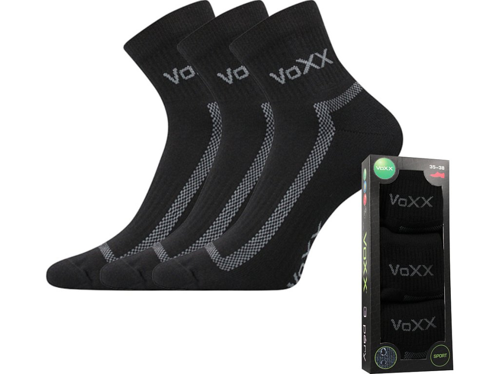 Sportovní ponožky VoXX® CADDY B jsou středně vysoké ponožky s froté chodidlem. Díky vysokému podílu bavlny jsou ponožky velmi příjemné na omak a výborně sají pot. Jsou vhodné na sportovní, fitness i volnočasové aktivity. Díky elastické zóně na nártu se ponožky nepřetáčí v obuvi a dobře drží na noze. Řetízkované špice nikde netlačí a nevznikají otlaky ani puchýře. Ponožky jsou balené v dárkové krabičce po 3 párech, teplotní třída A je pro teplejší klima od +10°C do +35°C.Doplňkové parametry