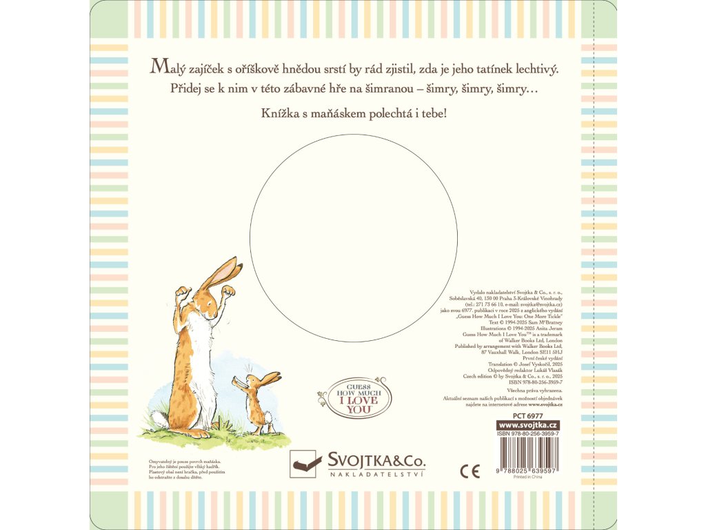 Táta zajíc s oříškově hnědou srstí a jeho malý synek si před spaním hrají na šimranou – a ty se můžeš přidat! Tato roztomilá knížka s maňáskem ti umožní stát se součástí večerního mazlení. Šimrej zajíčka na čumáčku, pod bradičkou i na packách a pomoz mu zjistit, kde ho to nejvíc lechtá. Příběh plný lásky, něhy a smíchu, ideální pro společné čtení před usnutím. Maňásek zabudovaný přímo do knihy přináší zábavné, interaktivní čtení, které děti i rodiče prostě milují.Doplňkové parametry