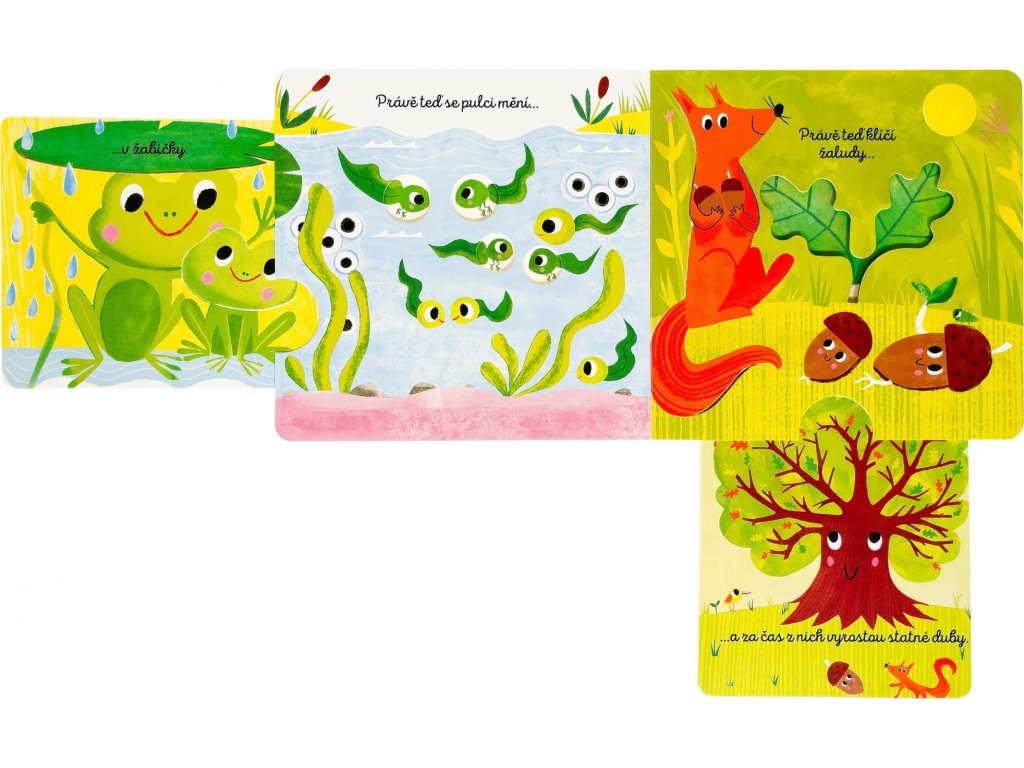 Tato kniha je krásně ilustrovaným interaktivním leporelem pro malé čtenáře, které je zavede do fascinujícího světa přírodních proměn. Sledujte s vašimi nejmenšími, jak se pulci mění v žáby, žaludy klíčí v mohutné duby a housenky se proměňují v pestrobarevné motýly. Naučte děti dívat se na svět kolem sebe a objevujte společně cykly přírody – od kapek deště tvořících řeku po semínka, z nichž jednoho dne vyroste jabloň či ohromná dýně. Díky jednoduchým a srozumitelným textům kniha dětem přibližuje zázraky přírody, probíhající každým dnem. Interaktivní vysunovací prvky rozvíjejí dětskou představivost a povzbuzují děti k hledání odpovědí na otázky, zatímco okouzlující podněcují dětskou zvídavost. Leporelo je ideální pro společné chvíle s rodiči i první samostatné čtení a objevování s knihou.Doplňkové parametry