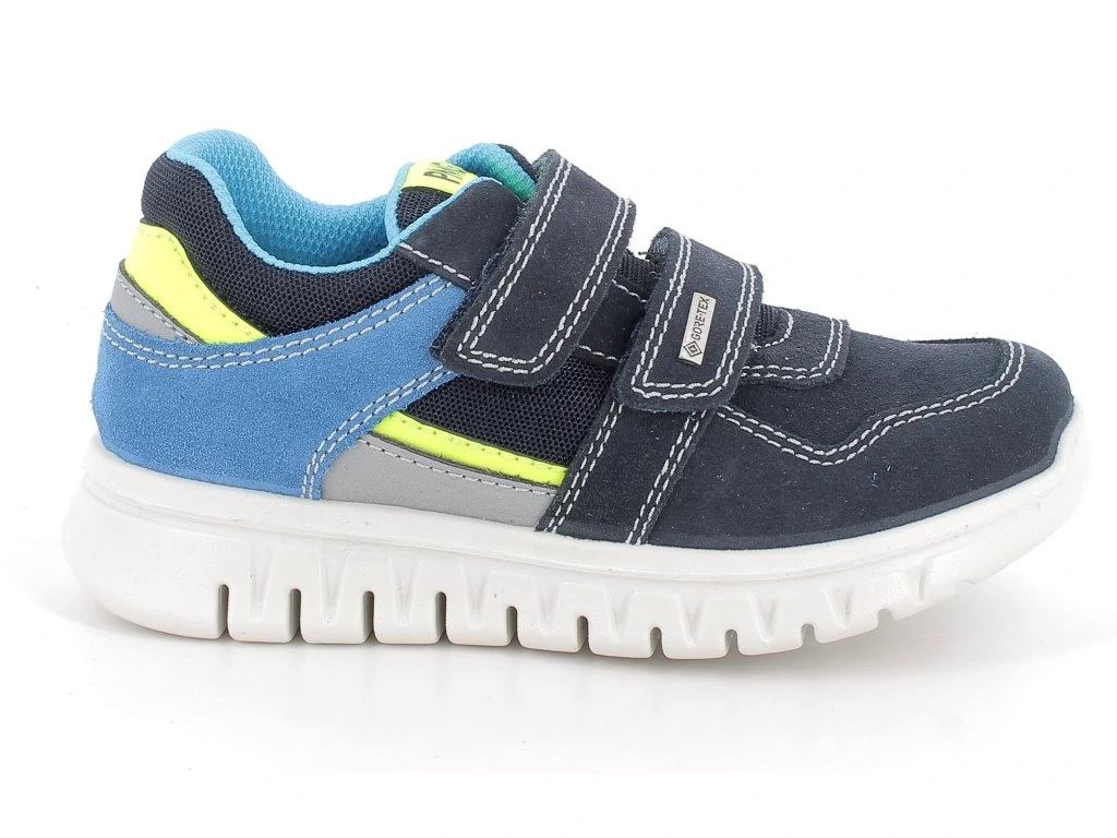 Dětské boty Primigi 1377600 Gore-Tex v modré barvě se svítivě žlutými detaily. Měkká broušená kůže v kombinaci s textilem a žlutými detaily a světlou podrážkou. GoreTEX membrána zajistí nepromokavost a zároveň prodyšnost, takže udrží dětské nožky v suchu a pohodlí. Ochranná vrstva na špičce proti okopání.