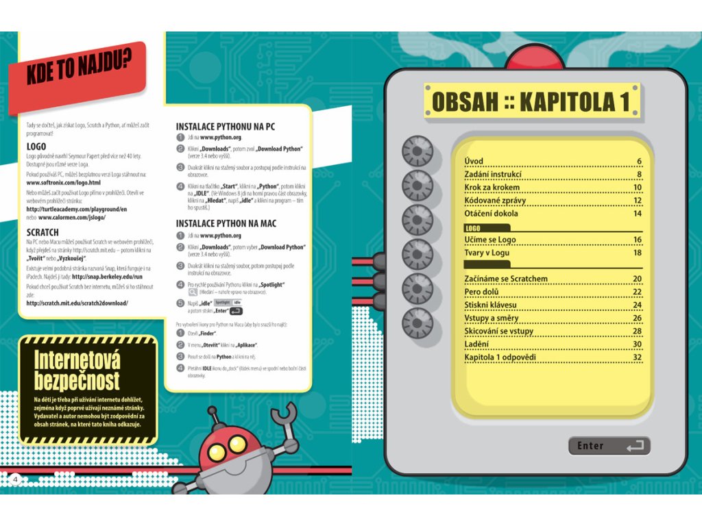 Vítej ve světě programů, kódů a programování. Chceš se naučit programovat? Tato knížka tě provede krok za krokem základními principy programování. Dozvíš se, co jsou to cykly, proměnné a větvení programů. Své programátorské schopnosti budeš rozvíjet, až se nakonec naučíš vytvořit vlastní www stránky… A je toho mnohem víc! Spolehni se na přátelské roboty-pomocníky, kteří ti vše názorně vysvětlí. Nauč se kódovací jazyk Logo, vytvářej hry ve Scratchi, programuj projekty v Pythonu a vyzkoušej si jazyk HTML, včetně JavaScriptu, který tvé webové stránky oživí.Doplňkové parametry