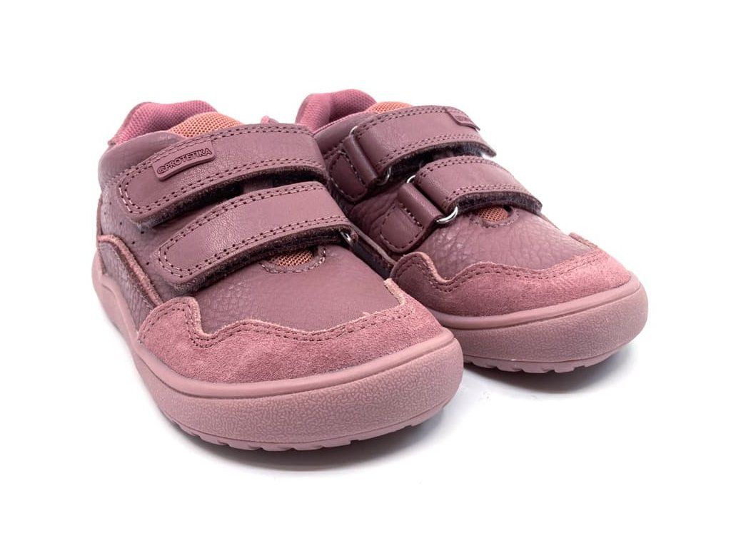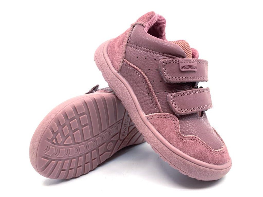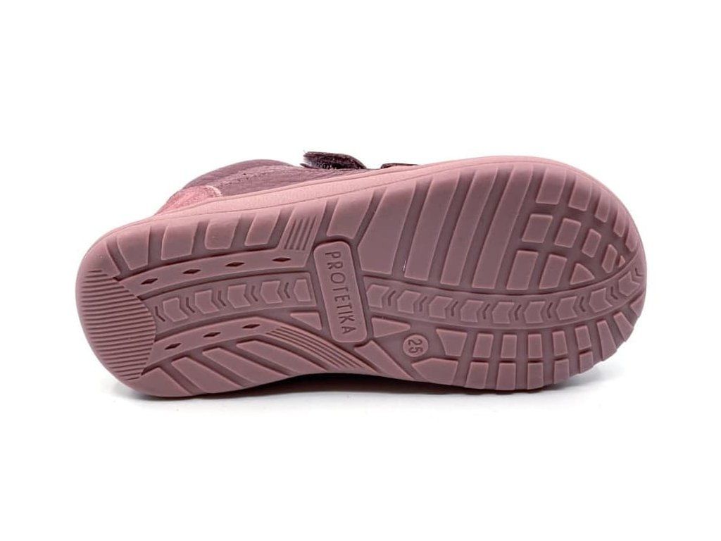 Protetika Ana Dark Pink v decentní tmavě růžové barvě jsou dívčí celoroční barefoot boty převážně z hladké kůže. S praktickým okopem z broušené kůže - boty se tak neokopou. Podšívka je textilní. Boty sednou na normálně široké nožky. Špička je dostatečně prostorná a a vhodná pro dominantní palce. Podrážka je měkká a ohebná.