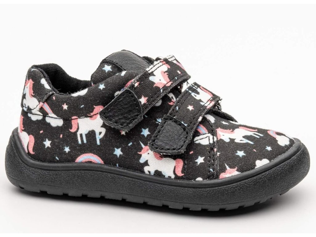 Protetika Koro Black s oblíbenými jednorožci jsou dívčí textilní barefoot tenisky, vhodné na jaro a léto. Sednou na normálně široké nožky, mají anatomický tvar vhodný pro dominantní palce. Podrážka je výborně ohebná všemi směry. Tenisky Koro vaše ratolest užije uvnitř i venku. Jsou perfektně prodyšné, mají textilní podšívku a stélku s nášlapem z příjemné kůže. Novinka roku 2026.