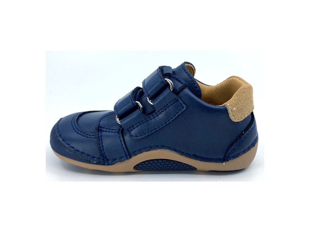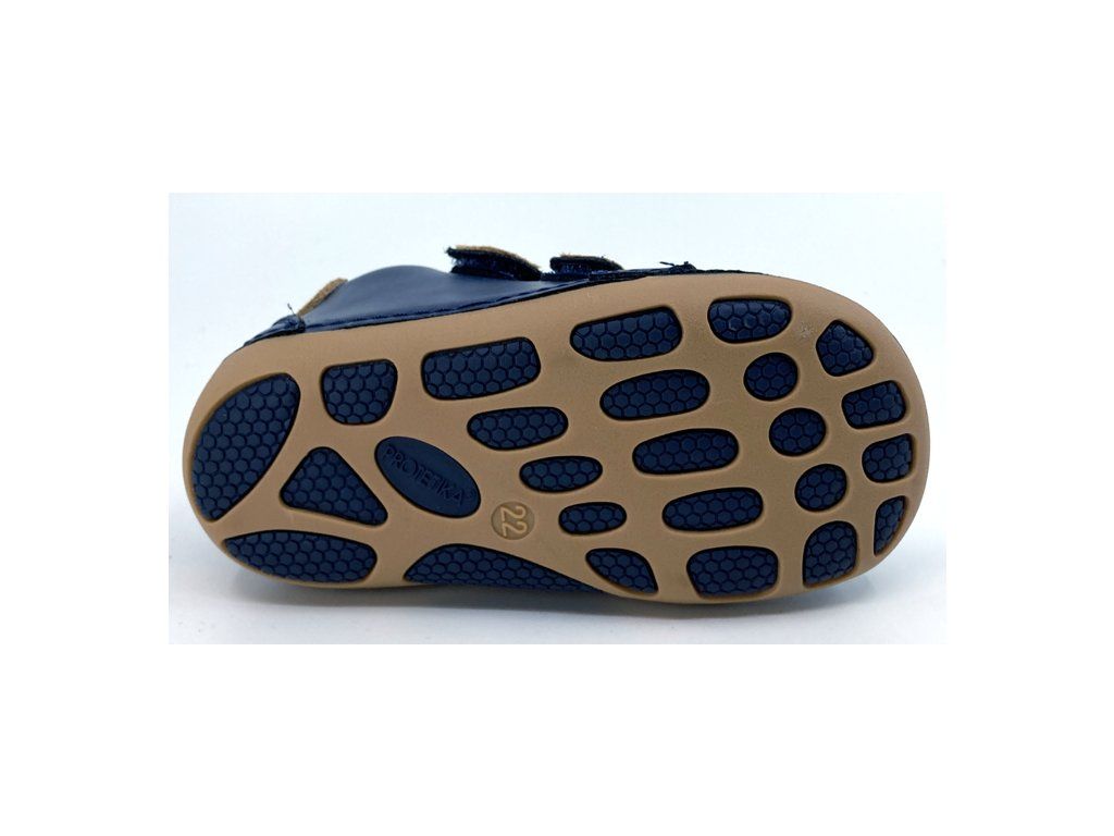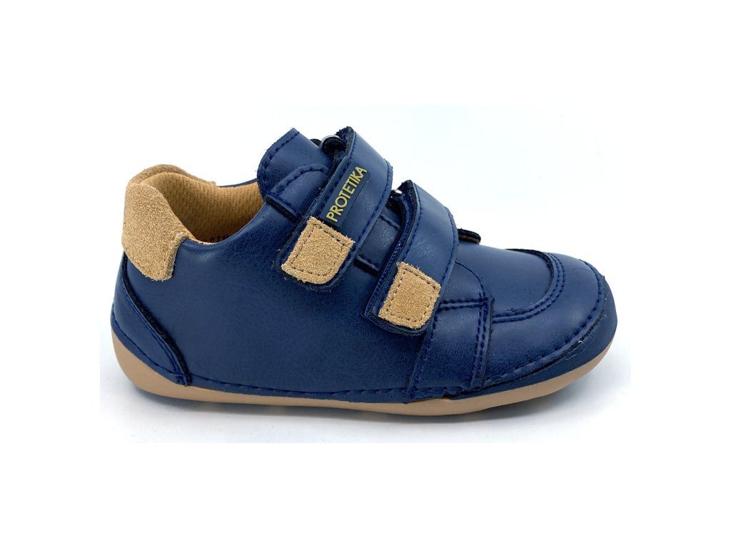 Protetika Maximo Navy v tmavě modré barvě s hnědými detaily - oblíbená barevná kombinace - jsou to chlapecké celoroční barefoot boty z hladké kůže, sednou na širší nožku. Špička je mírně kulatější, boty tak nejsou vhodné pro dominantní palec. Podrážka je měkká a ohebná. Nízké barefoot boty, hodící se na jaro ale i podzim.