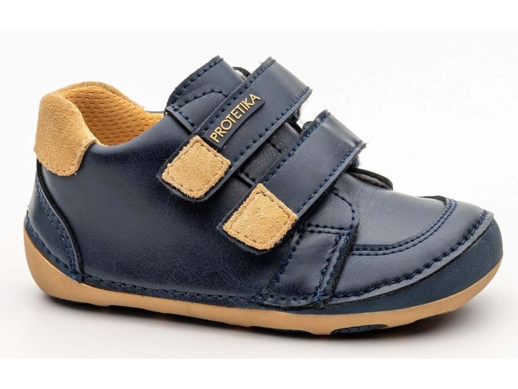 Protetika Maximo Navy v tmavě modré barvě s hnědými detaily - oblíbená barevná kombinace - jsou to chlapecké celoroční barefoot boty z hladké kůže, sednou na širší nožku. Špička je mírně kulatější, boty tak nejsou vhodné pro dominantní palec. Podrážka je měkká a ohebná. Nízké barefoot boty, hodící se na jaro ale i podzim.