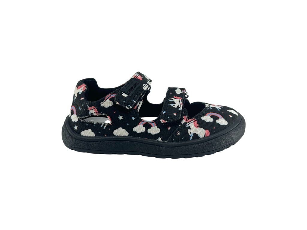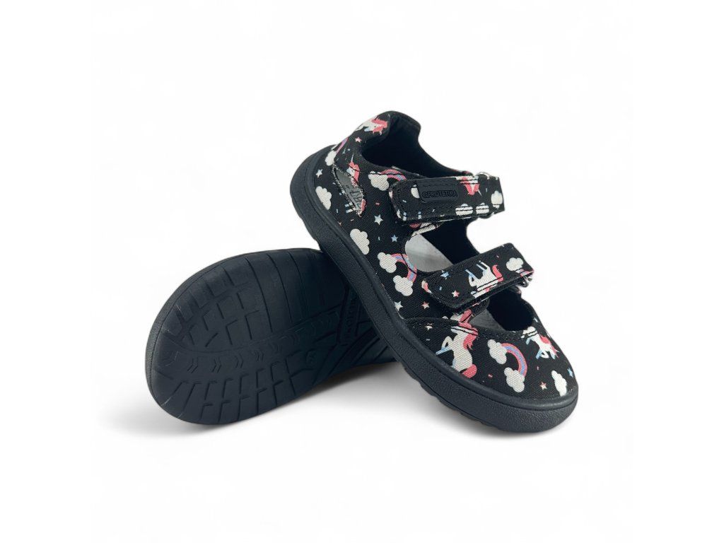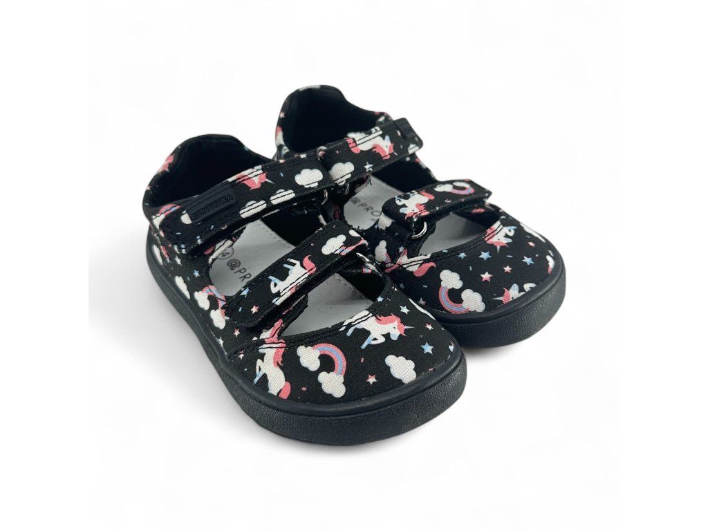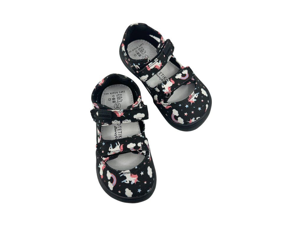 Textilní barefoot sandálky Protetika Tafi Black Uni v černé barvě s Unicorny (jednorožci) jsou skvělé na každodenní nošení během celého léta. Boty jsou měkké a ohebné. Sednou na průměrně široké nožky s dominantním palcem.