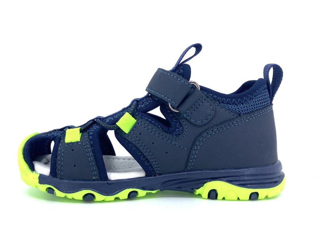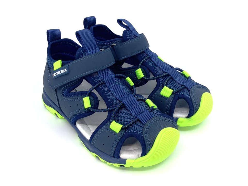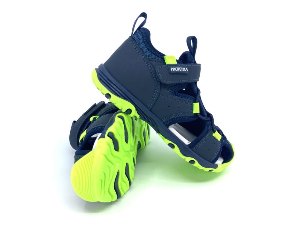 Protetika Ted Navy v tmavě modré barvě s neonově zelenými prvky jsou letní sandále ve sportovním stylu skvělé na běžné nošení do města i sport. Pevná uzavřená pata zabraňuje "šmajdání", překryté prsty jsou perfektní na dětské lítání venku.