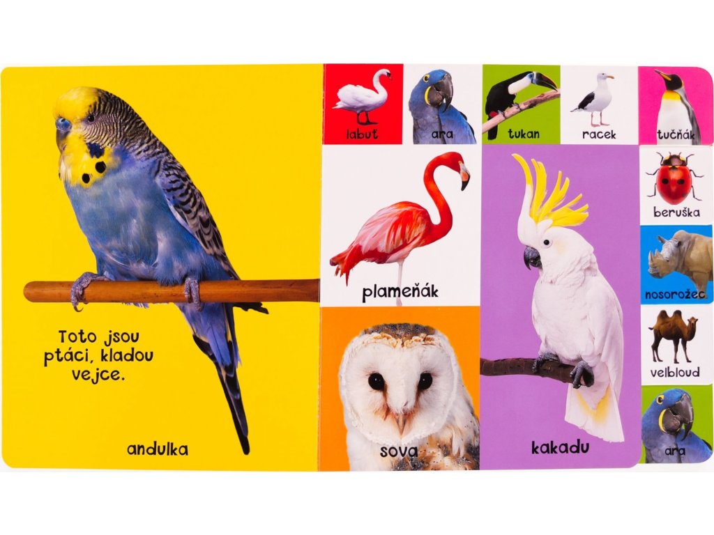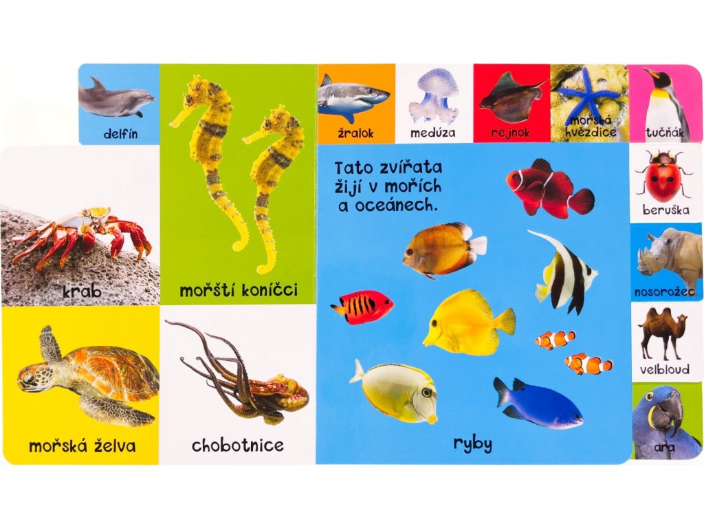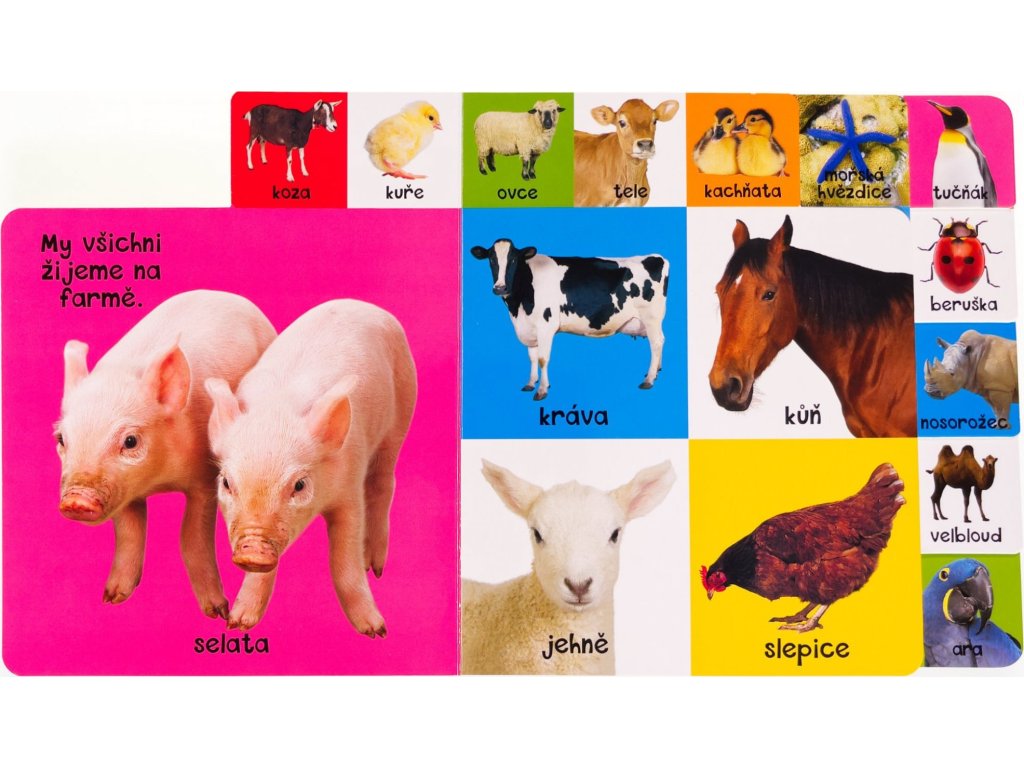 Tato knížka s pevnými záložkami, díky kterým mohou i malé děti stránky snadno otáčet, obsahuje názvy nejznámějších zvířat z různých prostředí, ať už je to domácnost, farma, moře nebo Afrika. Je ideální pomůckou pro rozvoj řeči malých dětí. Stránky mají po stranách a na vrchu pevné záložky, které lze uchopit, otočit a nalistovat přesně to zvíře, které si chcete prohlédnout. Dětské prstíky se tak dostanou hned tam, kam chtějí. Knížka je plná jasných, barevných fotografií a jednoduchých popisků s pojmenováním zvířat. Představuje vynikající platformu pro první učení dětí a rozšiřování slovní zásoby.Doplňkové parametry