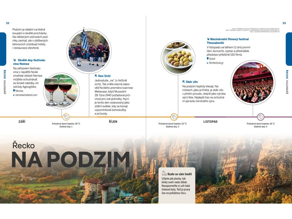 Procházejte se po antických stezkách pod horou Olymp, relaxujte na pláži s růžovým pískem, ochutnávejte lahodné víno na sopečných vinicích na Santorini… Řecko je země bohatá na přírodní krásy, jedinečnou historii a inspirativní kulturu. Vydejte se za dobrodružstvím šitým milovníkům antické kultury na míru a pronikněte k samotnému srdci Řecka stylově!Popsali jsme nejzajímavější místa, navrhované trasy a místní tajemství do snadno použitelné podoby, pečlivě připravené našimi zkušenými autory. Tento průvodce bude to jediné, co budete potřebovat na nezapomenutelnou cestu po Řecku. Nakladatelství Lonely Planet již 50 let inspiruje a informuje cestovatele, kteří tak mohou po celém světě poznat skvělé zážitky. Naši zkušení autoři úspěšně objevují ta nejzajímavější místa a vzrušující zážitky. Za pozitivní hodnocení nikdy nepřijímají žádné platby. Můžete si tedy být jistí, že naše rady jsou pečlivě prověřovány přímo na cestě a odrážejí místní znalosti.