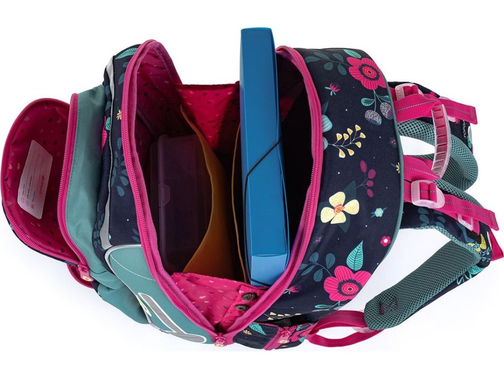 Jedna komora główna tornistra BEBE ułatwi dziecku organizację i rozdzielenie książek, wyposażenia do szkoły. Wnętrze tornistra jest podzielone na trzy części żółtymi przegródkami, które są wodoodporne. Dlaczego? rozlane farby, rozgnieciony banan nie przedostaną się do innej przegrody, w Topgalu myślimy o takich detalach. Wewnątrz komory głównej znajdziesz także organizer na np. kartę obiadową, kredki itd. Jest tu też mała kieszonka zamykana na zamek. Butelkę z napojem polecamy umieścić w kieszeni zewnętrznej z boku tornistra, która jest zapinana na zamek. Butelka nie jest wyposażeniem tornistra.