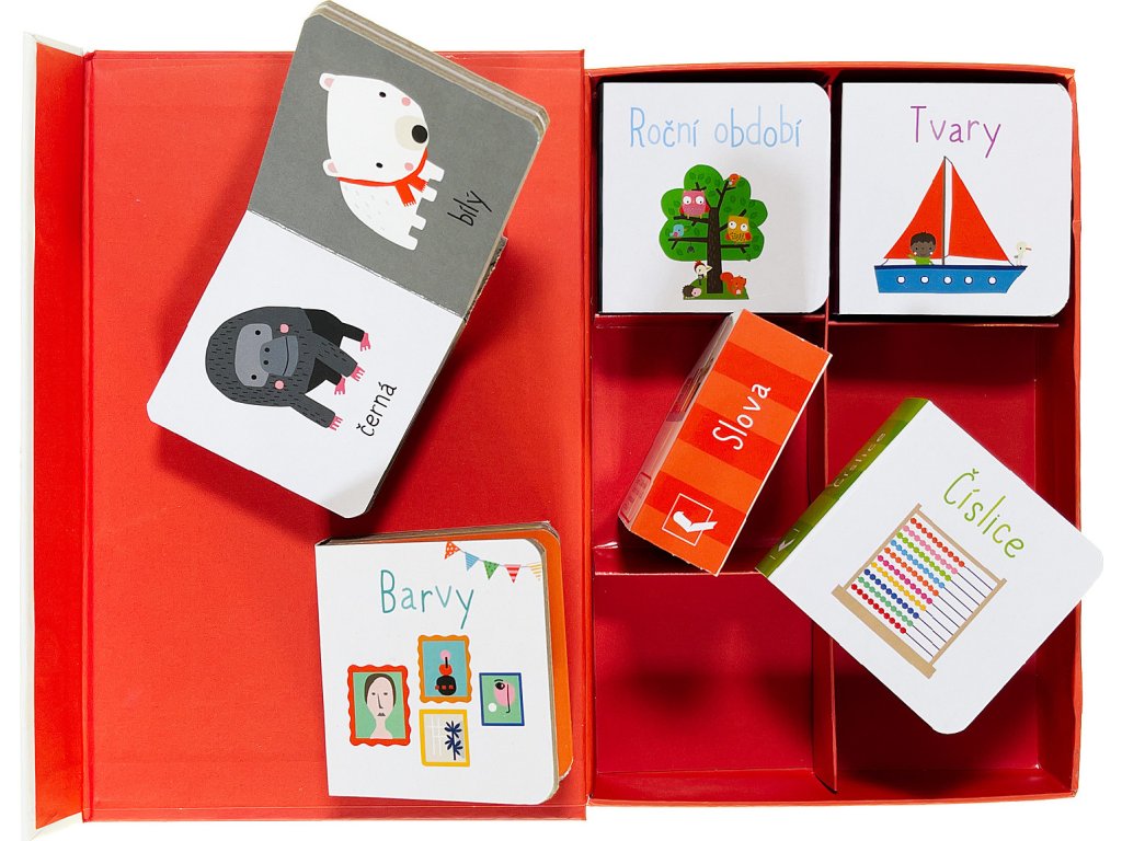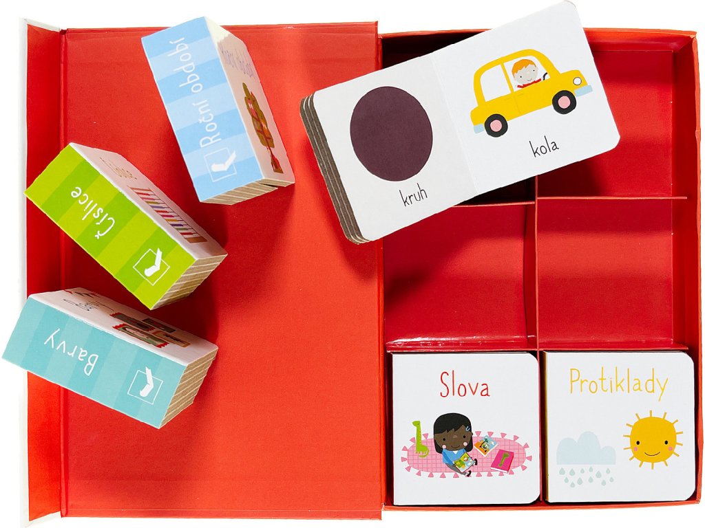 Barvy, protiklady, roční období, tvary i číslice, první slova – tato sada knížek pomůže vašim dětem učit se nová slůvka. Obsahuje celkem 60 inspirativních barevných obrázků, které se děti naučí zábavnou formou pojmenovávat. Celkem šest malých knížek, které jsou velikostí vhodné přesně pro dětské ručičky, je přehledně uspořádáno v odolné krabici s magnetickým zavíráním. Už žádné hledání maličkých knížek v knihovně – tuto praktickou sadu v ní jistě nepřehlédnete!Doplňkové parametry
