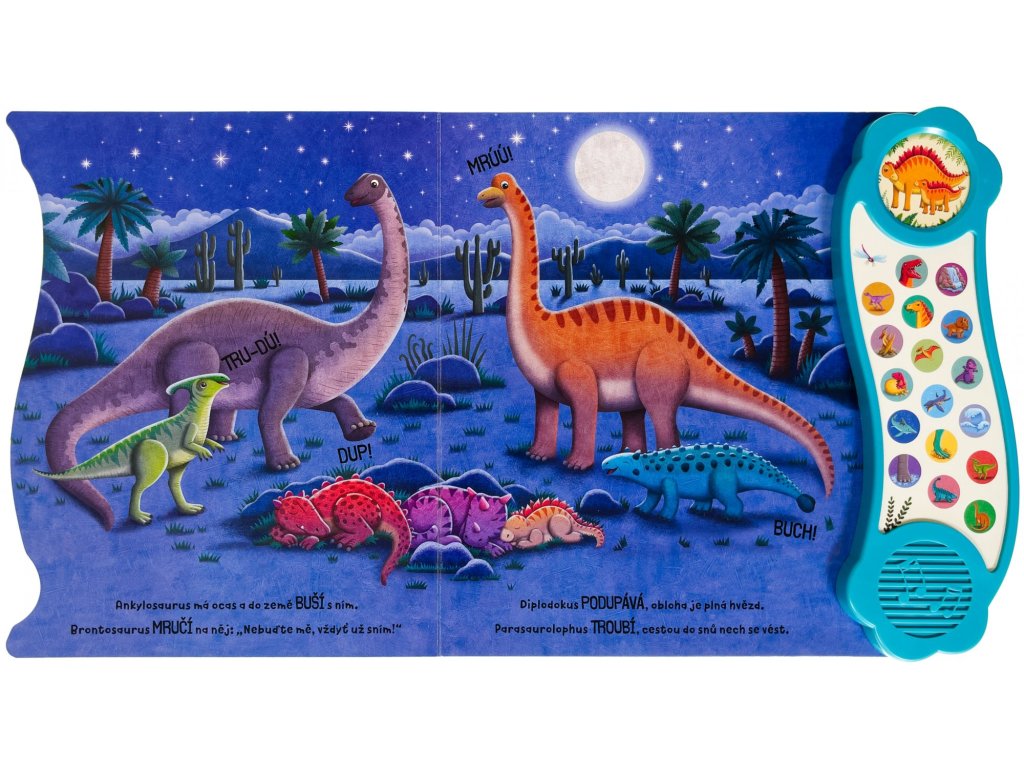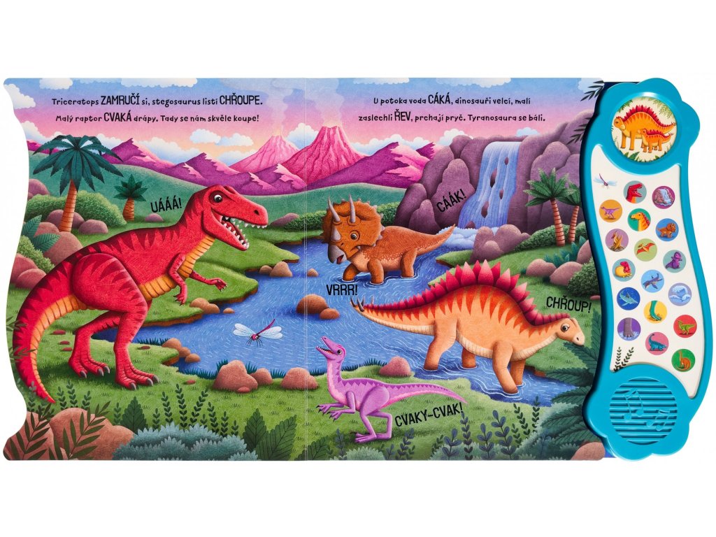 Objevte rušný svět plný dinosaurů s touto úžasnou zvukovou knihou. Nakoukněte do výšek k pterodaktylům a do hlubin oceánů za prehistorickými mořskými ještěry, na souši potkáte i neohroženého T-rexe. Poslechněte si 18 různých zvuků a jednu zábavnou písničku, které vás vtáhnou do fascinujícího světa plného vyhynulých tvorů. Tato kniha je ideální pro malé objevitele dinosauřího světa, kteří chtějí hravou formou poznávat tajemství prehistorické éry.Doplňkové parametry