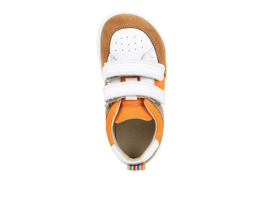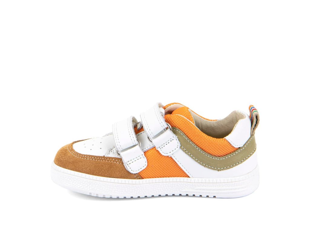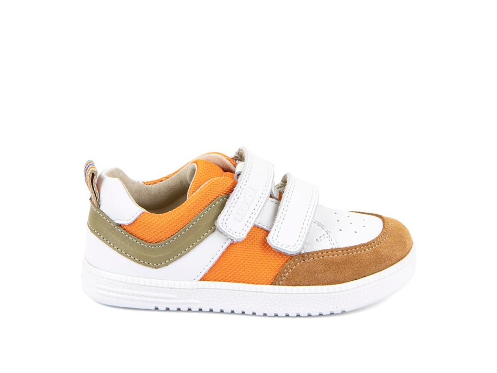 Stylové barefoot celoročky Froddo Zeru G3130282-3 White/Cognac v originální bílo-oranžové kombinaci. Tenisky sednou na užší až normální nožku a jsou vhodné pro normální nárt. Díky zapínání na suchý zip se snadno obouvají i dětem ve školce.