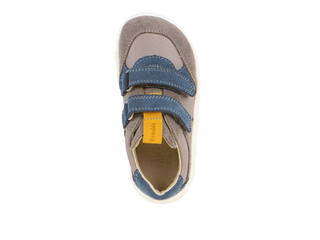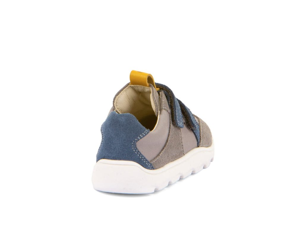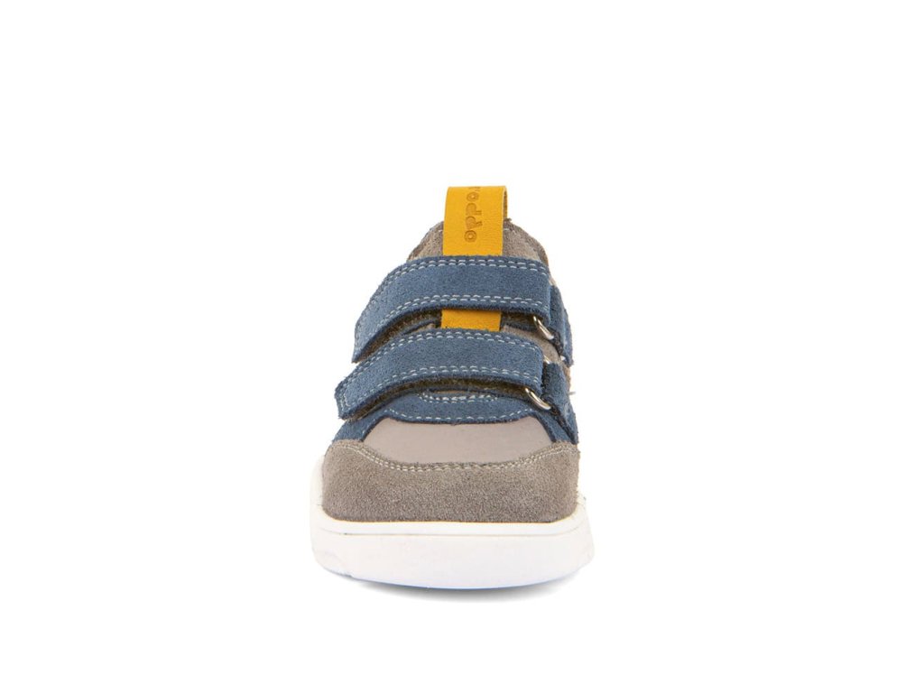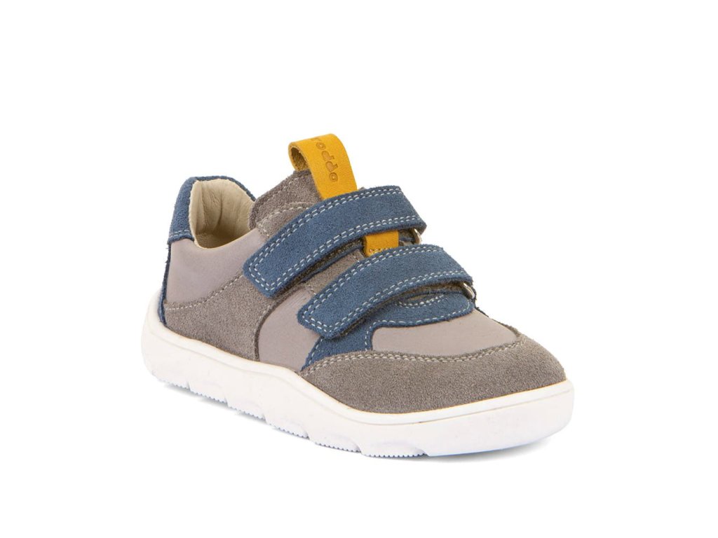 Stylové barefoot celoročky Froddo Zeru G3130264-3 Grey v šedé barvě s modrými prvky. Tenisky sednou na užší až normální nožku a zvládnou i vyšší nárt. Díky zapínání na suchý zip se snadno obouvají i dětem ve školce.