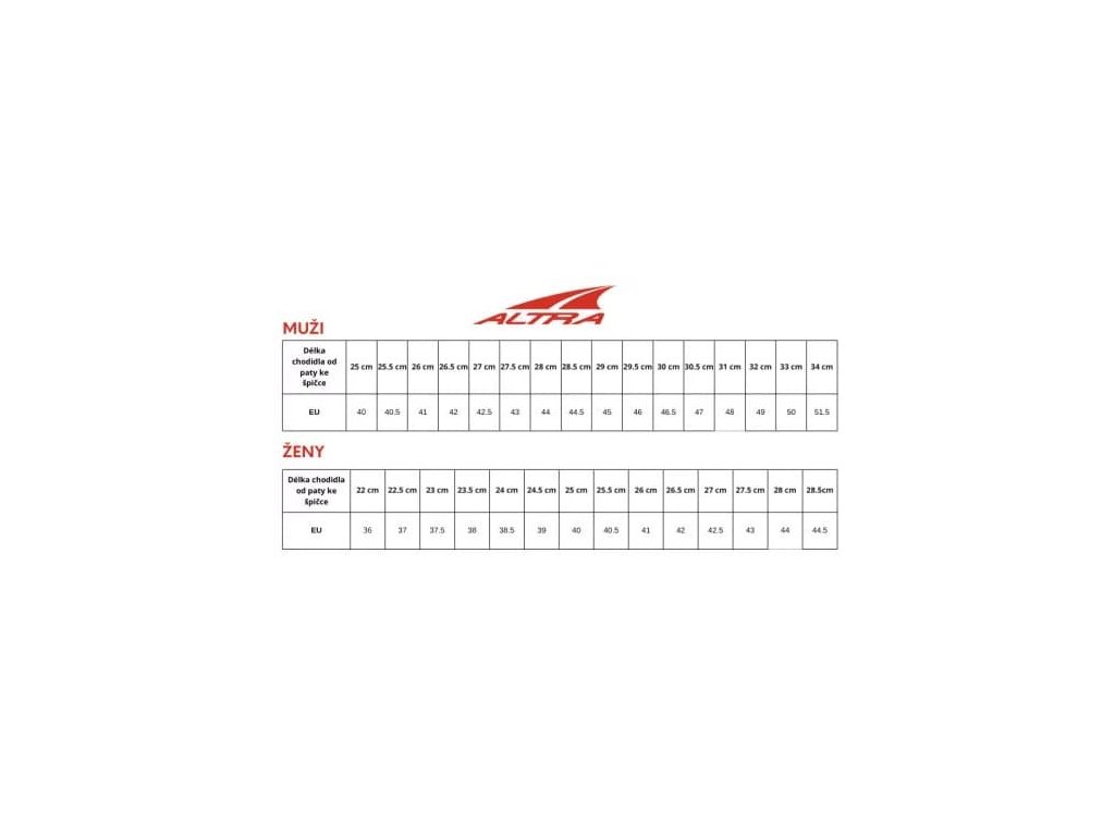 Všechny modely bot americké značky Altra jsou přizpůsobeny rozdílné anatomii mužského i ženského chodidla. Mužská noha má přirozeně širší patu a střední část chodidla, nižší nárt, kratší klenbu a menší rozestupy mezi nártními kostmi.