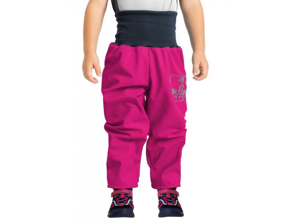 Unuo dětské zateplené softshellové kalhoty ve fuchsiové barvě. V klasické variantě vhodné pro děti nosící pleny, ve variantě SLIM pro děti bez plen.