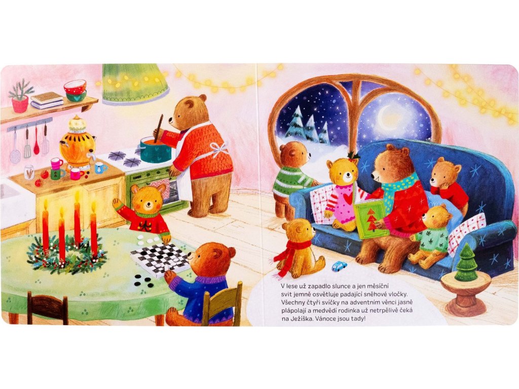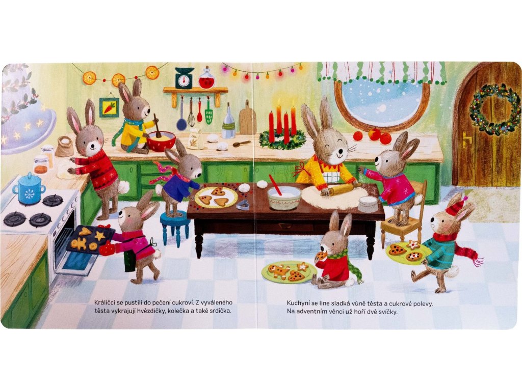 Během adventu mají všichni plno práce. Zvířecí rodinky vyrábějí krásné dekorace, pečou cukroví nebo nacvičují vánoční koledy. Až nastane Štědrý večer, zvířátka ho společné oslaví v zasněženém lese. Nahlédněte k zvířátkům do domečků a nechte se zahřát kouzelnou sváteční atmosférou. Zkraťte si čekání na Ježíška a na konci této vánoční knížky postupně otvírejte 24 adventních okének.Doplňkové parametry