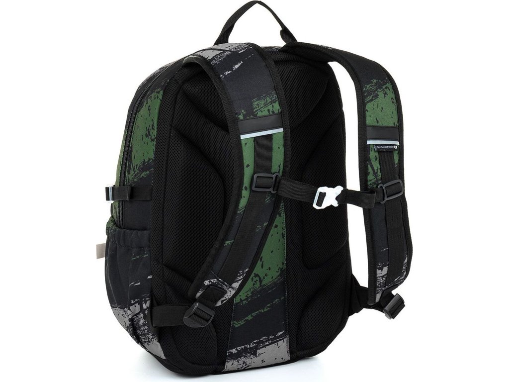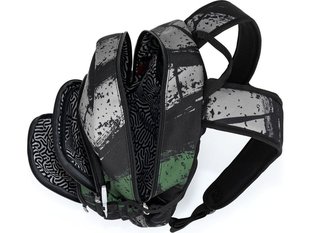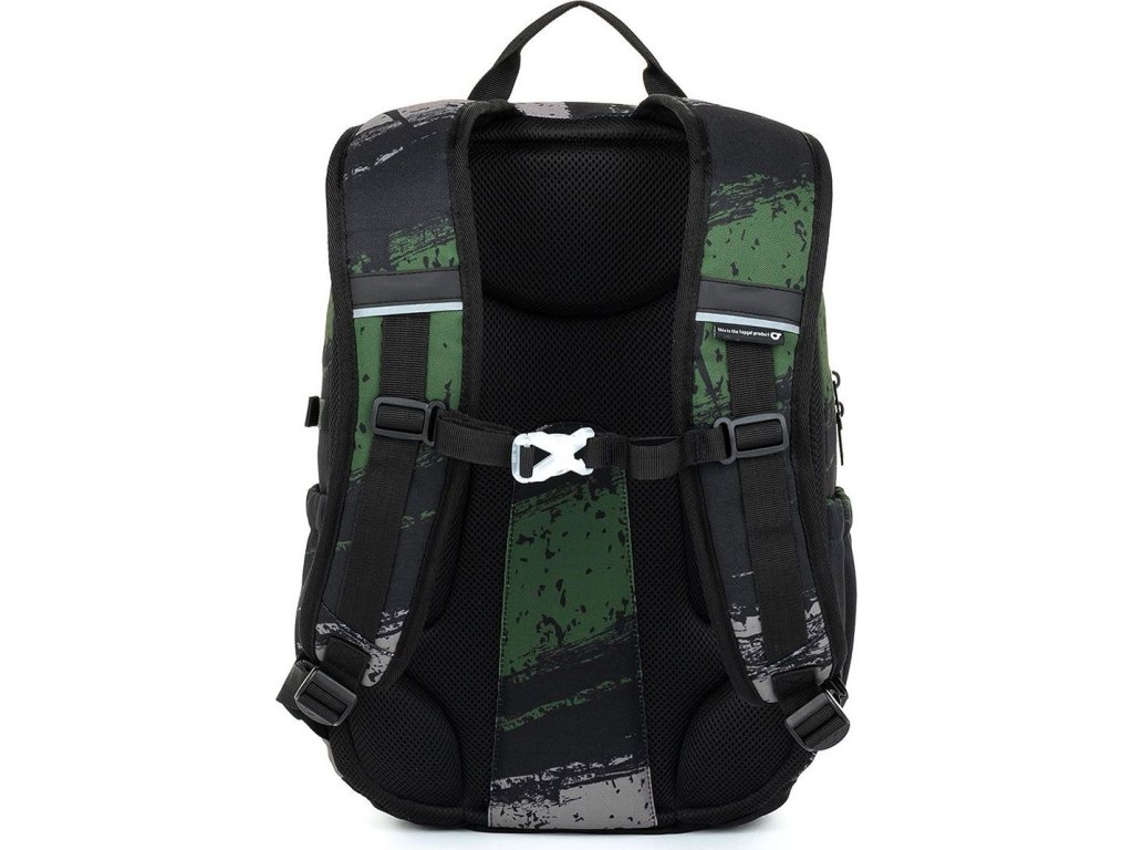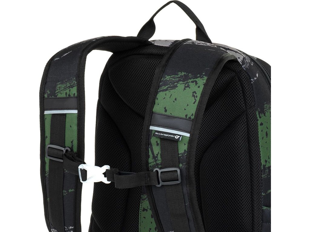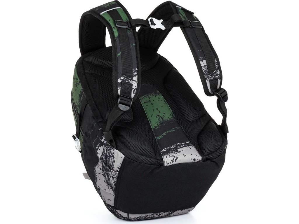 Jednokomorový batoh s zeleným a šedým žíháním doplní každodenní outfit dospívajícího kluka. Záda batohu jsou polstrovaná, anatomicky tvarovaná a pevná díky lehké hliníkové výztuze. Uvnitř zadní komory je umístěna polstrovaná kapsa na notebook i tablet.