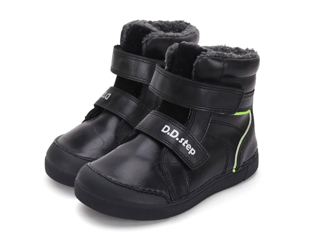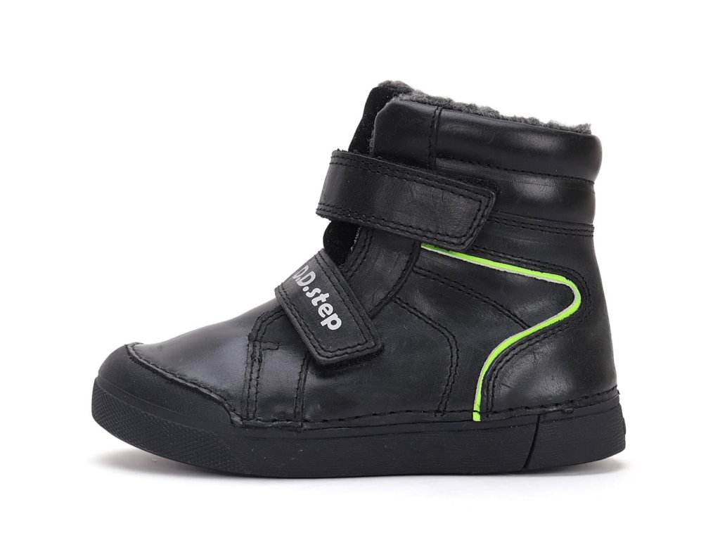 Vyšší kotníkové zimní boty DDstep W068-42804A Black v unisex černé barvě. Vnějšek kompletně z hladké kůže pro snadnou údržbu, teplý kožíšek uvnitř celé boty. Vyjímatelná pěnová stélka pro možnost kontroly velikosti s kožíškovým nášlapem. Řada typická pro pevný opatek a širší přední část ve špičce. Kožené boty s černou podrážkou, která je měkká a ohebná hlavně ve směru chůze - příčně. Přední část má vyvýšenou podrážku ve špičce a chrání tak botu proti okopu. Dva suché zipy pro možnost utažení v oblasti nártu i kotníku.