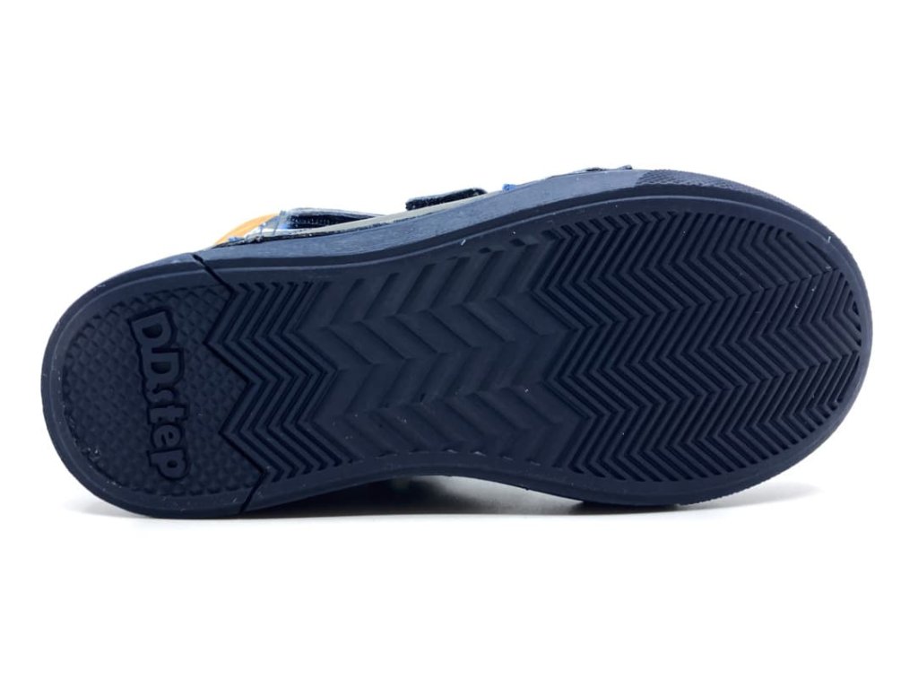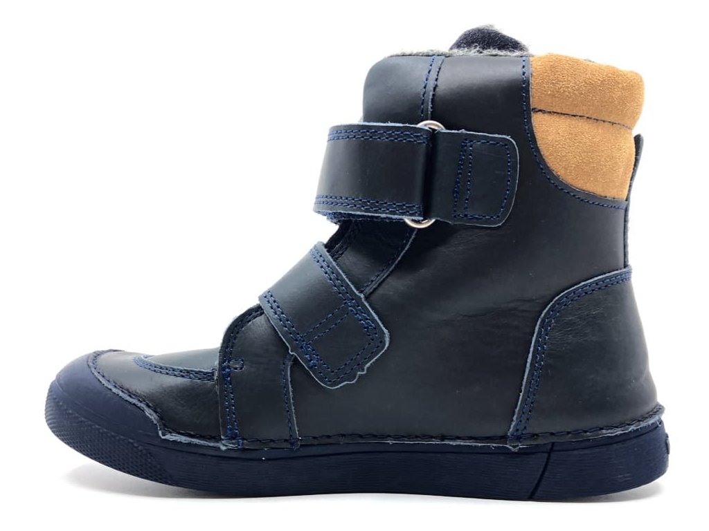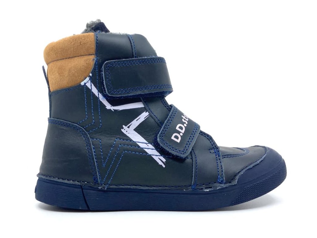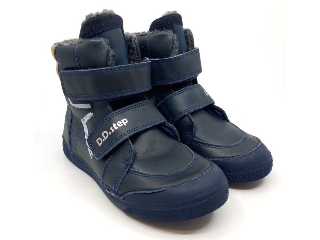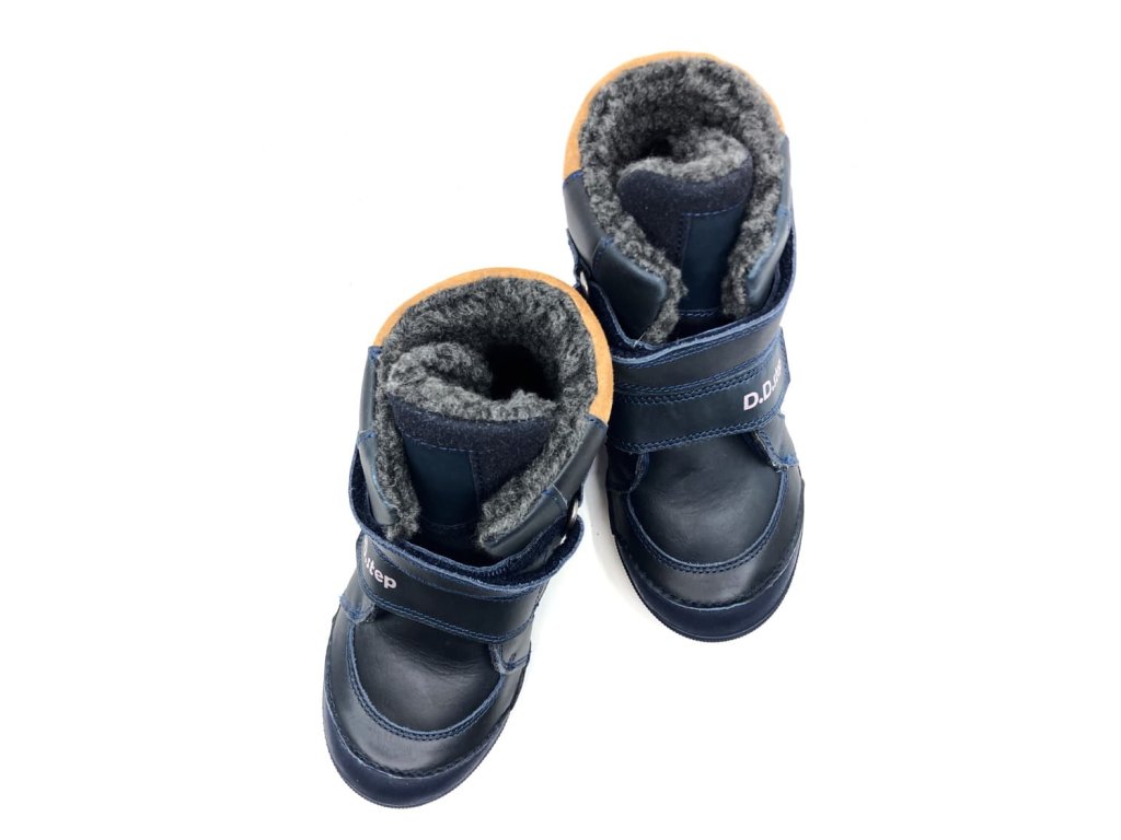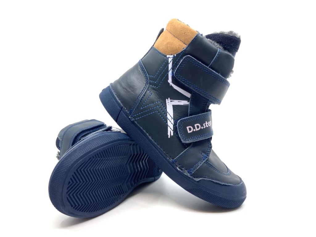 Chlapecké zimní boty DD Step W068-42921B Royal Blue v tmavě modré barvě. Boty končí přibližně 3 cm nad kotníkem a mají teplý kožíšek uvnitř celé boty. Vyjímatelná pěnová stélka pro možnost kontroly velikosti s kožíškovým nášlapem. Řada typická pro pevný opatek a širší přední část ve špičce - její kulatý tvar ale není vhodný pro dominantní palec. Kožené boty s podrážkou, která je měkká a ohebná hlavně ve směru chůze - příčně. Přední část má vyvýšenou podrážku ve špičce a chrání tak botu proti okopu. Dva suché zipy pro možnost utažení v oblasti nártu i kotníku.