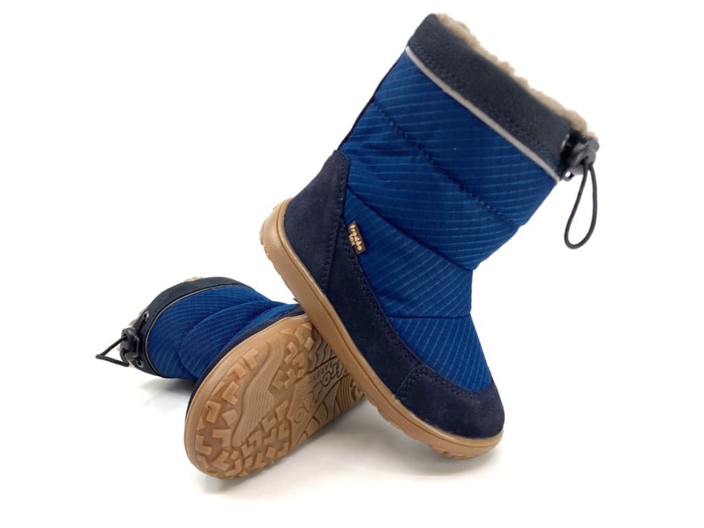 Zimní boty Froddo G3160249-1 Dark Blue s jednoduchým designem - odolná tmavě modrá textilie s koženými detaily s podrážkou z přírodní gumy. Podrážka je nyní (na podzim/zimu 25/26) výrazně měkčí a ohebnější než dříve, odolný vzorek zůstal.
