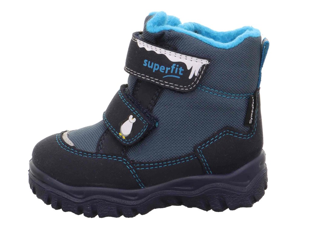 Zateplené zimní dětské boty Superfit Husky1 Blau/Türkis 1-006047-8000 s nepromokavou a prodyšnou membránou Sympatex. Jazyk boty je po stranách přišitý k botě, čímž zamezuje zapadání sněhu do boty. Zateplení nekousavým a příjemným kožíškem.