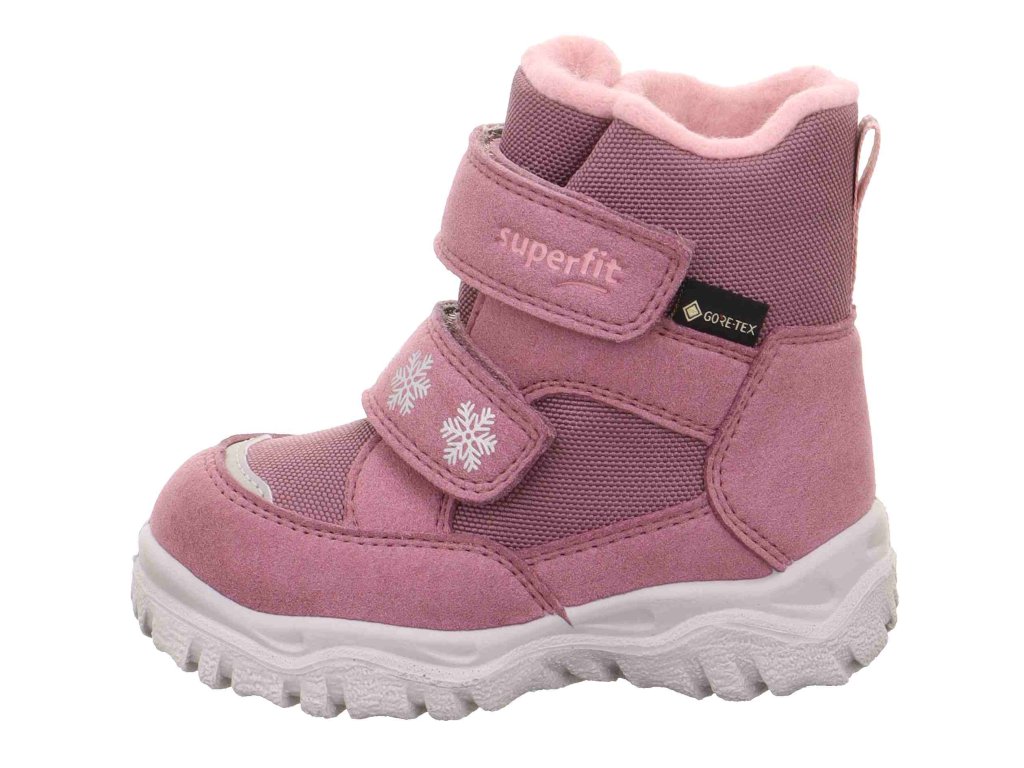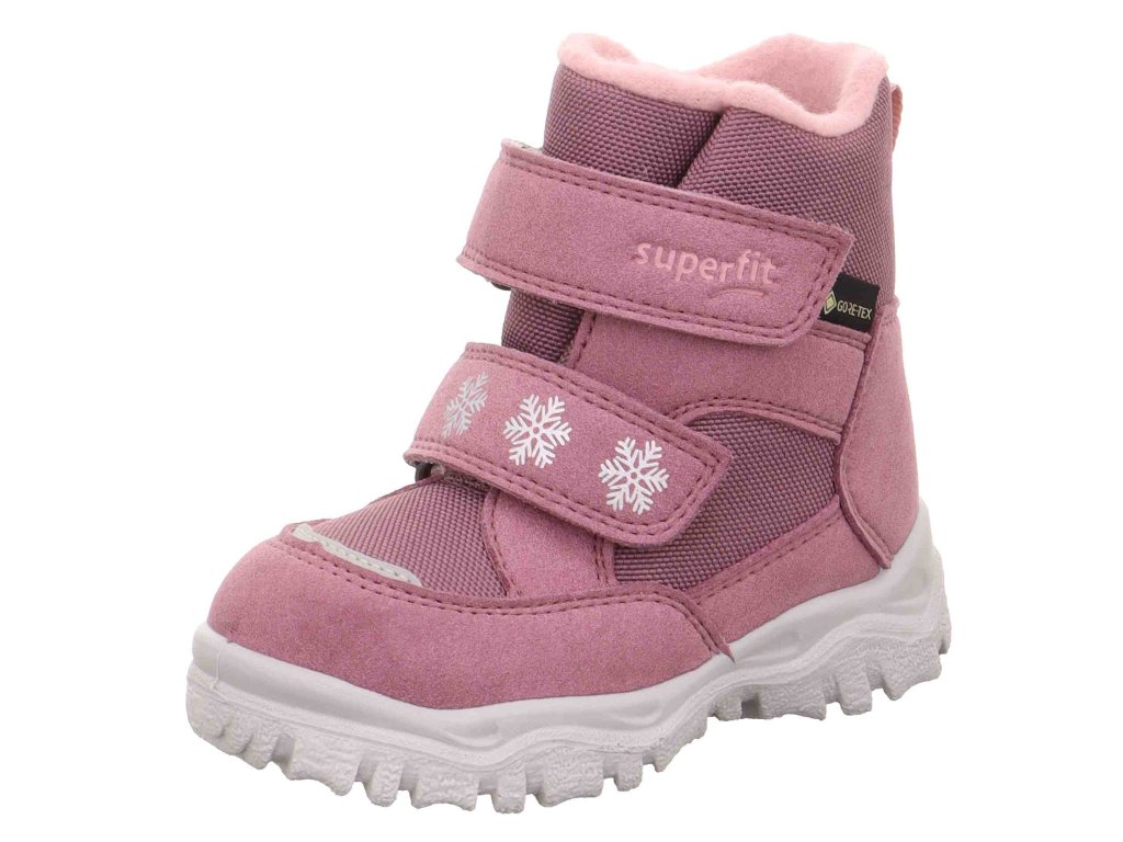 Zateplené zimní dětské boty Superfit Husky1 Lila/Rosa v růžové barvě s nepromokavou a prodyšnou membránou Gore-Tex. Jazyk boty je po stranách přišitý k botě, čímž zamezuje zapadání sněhu do boty. Zateplení nekousavým a příjemným kožíškem.